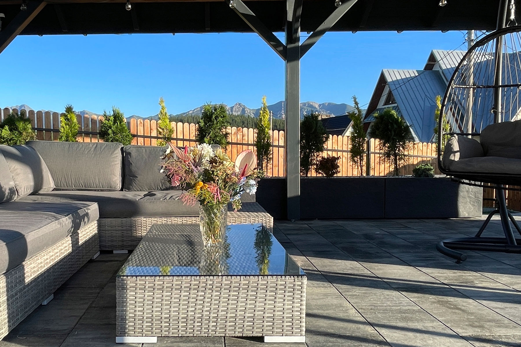 To letnie serce domu — z wygodnym narożnikiem, wiszącym fotelem, girlandami i światłami, które tworzą klimat. A do tego jeszcze wygodna kuchnia i opalany drewnem grill. Można tu złapać chwilę spokoju z cudownym widokiem, posiedzieć pod kocykiem i poczytać książkę, poodychać górskim powietrzem, albo... rozkręcić szaloną imprezę z przyjaciółmi czy sąsiadami!